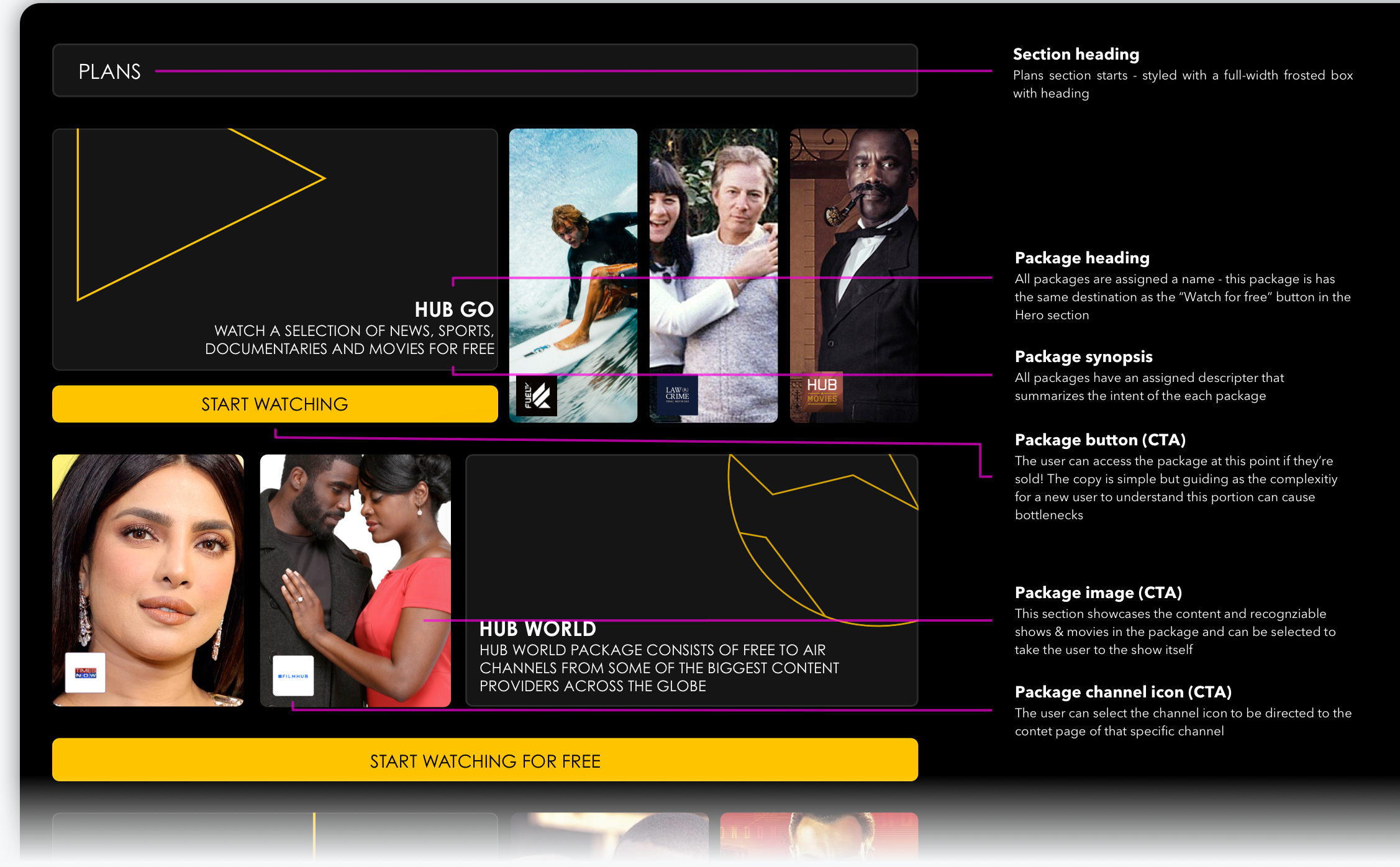 I worked with Neil to explored the usage of color during the rebuild and came to an understanding that the heavy use of purple our main and primary color would not do the cinematic feel we were looking for justice and sticking with the black space over a brand primary color would work best for legibility. The use of Yellow would now become the primary color used throughout the platform - some treatments below.